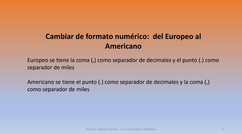 Existen dos tipos de formatos numéricos, el europeo y el americano